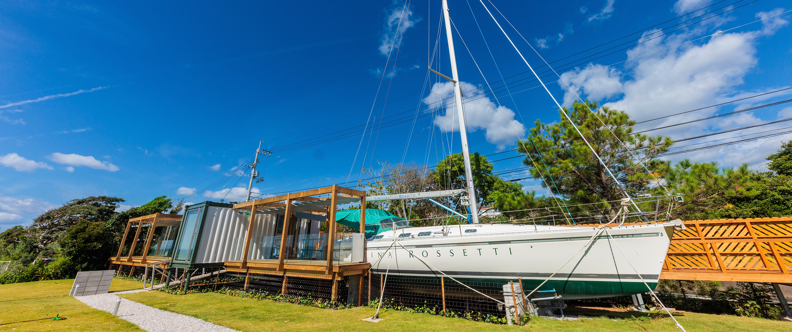 和建設が企画・運営する 「ナミテラス芸西」 は、コンテナ棟2棟をはじめ、ヨット内部に宿泊できるヨット棟、一戸建てのヴィラ、そして宿泊者専用のサウナを備えた複合型宿泊施設です。