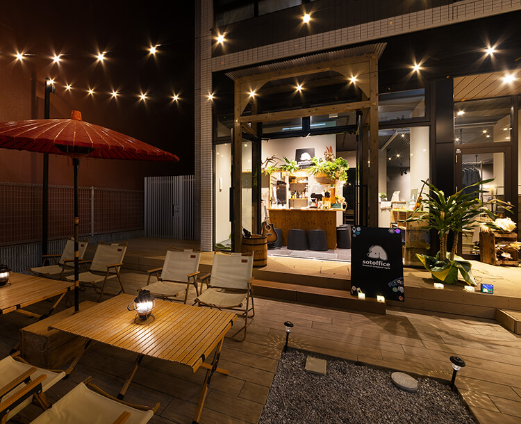 高知市中心部に位置する京町商店街に誕生した和の森sotofficeは、カフェバー併設のシェアオフィス、コワーキングスペース、レンタルスペースが一体となった複合型シェアスペースです。