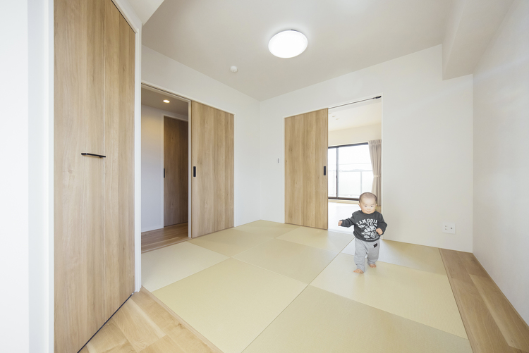 「日中は子どもの遊び場になり、キッチンやダイニングからでも見守れる安心感が嬉しいですね。子どもが小さいうちは、ここに親子3人で就寝。移動も寝かしつけもラクチンで、本当に助かっています。廊下とLDKのそれぞれに扉を設け、回遊できる動線にしたのもこだわりです。ここを子どもがぐるぐると回って遊ぶこともよくあるんですよ。僕自身にとって和室は、ごろっとできるくつろぎの場。マルチに使える空間に大満足しています」(ご主人)