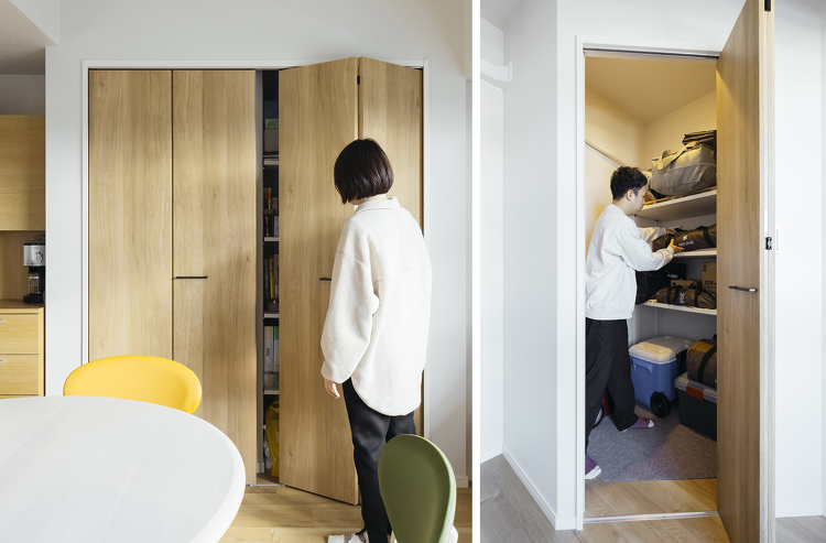 「なかでもこだわったのが収納です。キッチン横には壁面収納を造作し、日用品や資料といった日々使う細々としたものは、まとめてここへ。洋室の納戸は、キャンプギアの重さに耐えられるように棚板を厚く変更。テレビ上や柱の凹凸で生まれたデッドスペースは、収納に変えて有効活用。おかげで家の中がすっきり片付いています」(奥さま)
