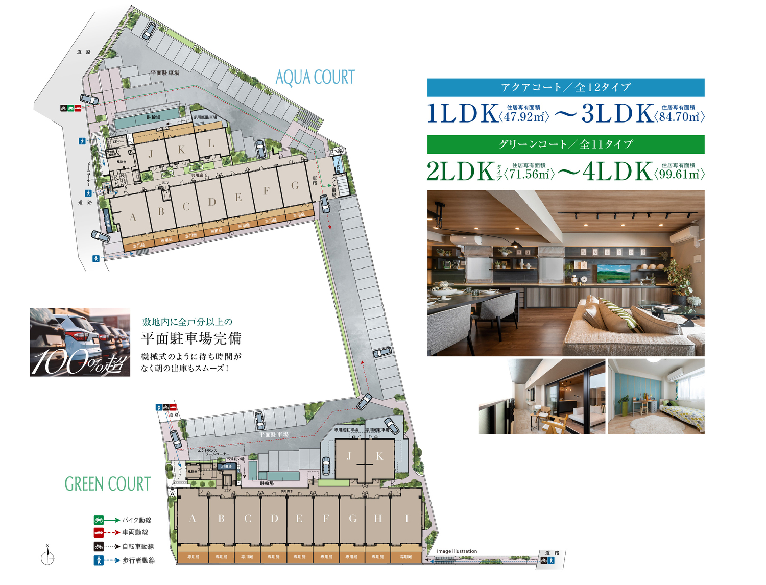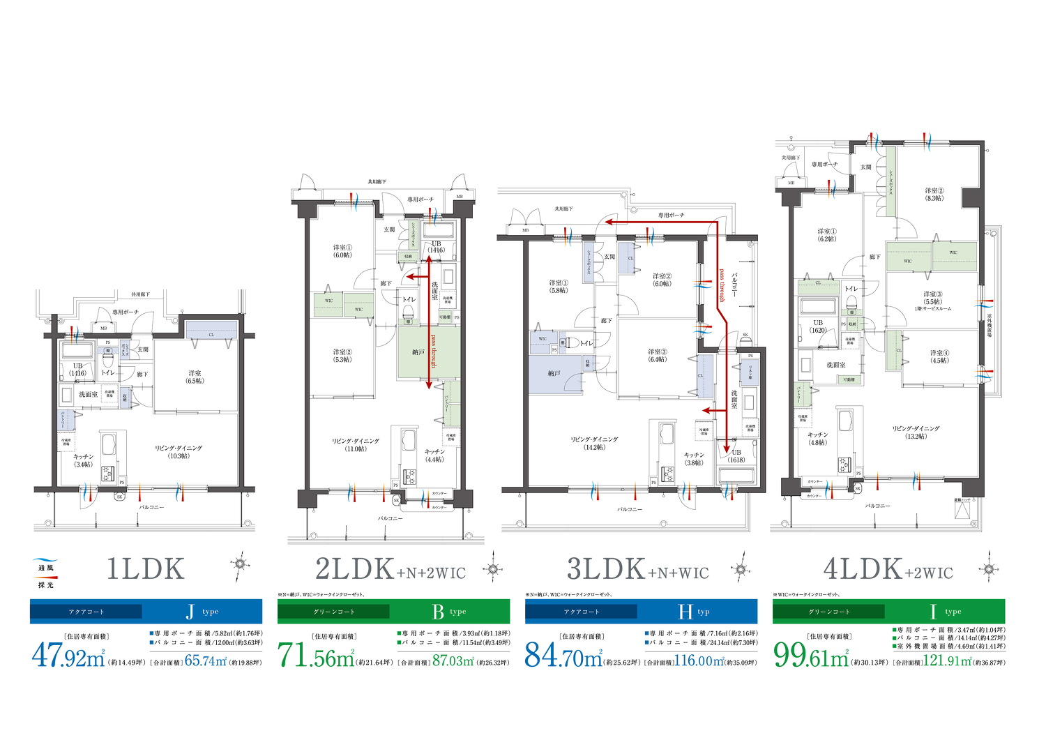 アクアコートは1LDK〜3LDKの全12タイプ。グリーンコートは2LDK〜4LDKの全11タイプと、ライフスタイルに合わせてお選びいただけるよう豊富なプランバリエーションをご用意。