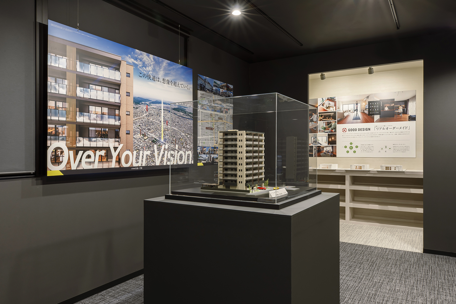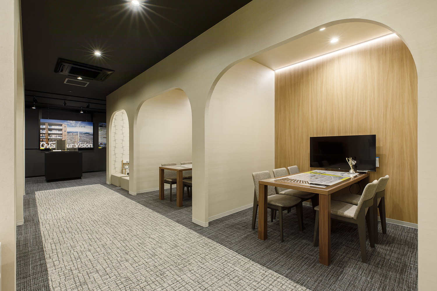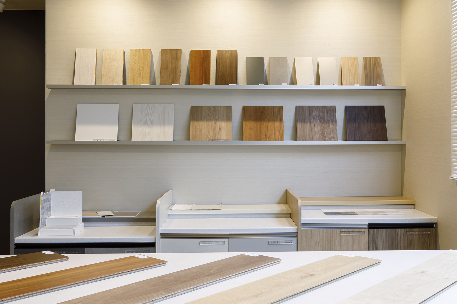 マンションギャラリー内には打合せスペースがありドアや床などの色味をご覧いただけるサンプルや外観の模型、タイプごとにお部屋の模型などもあります。