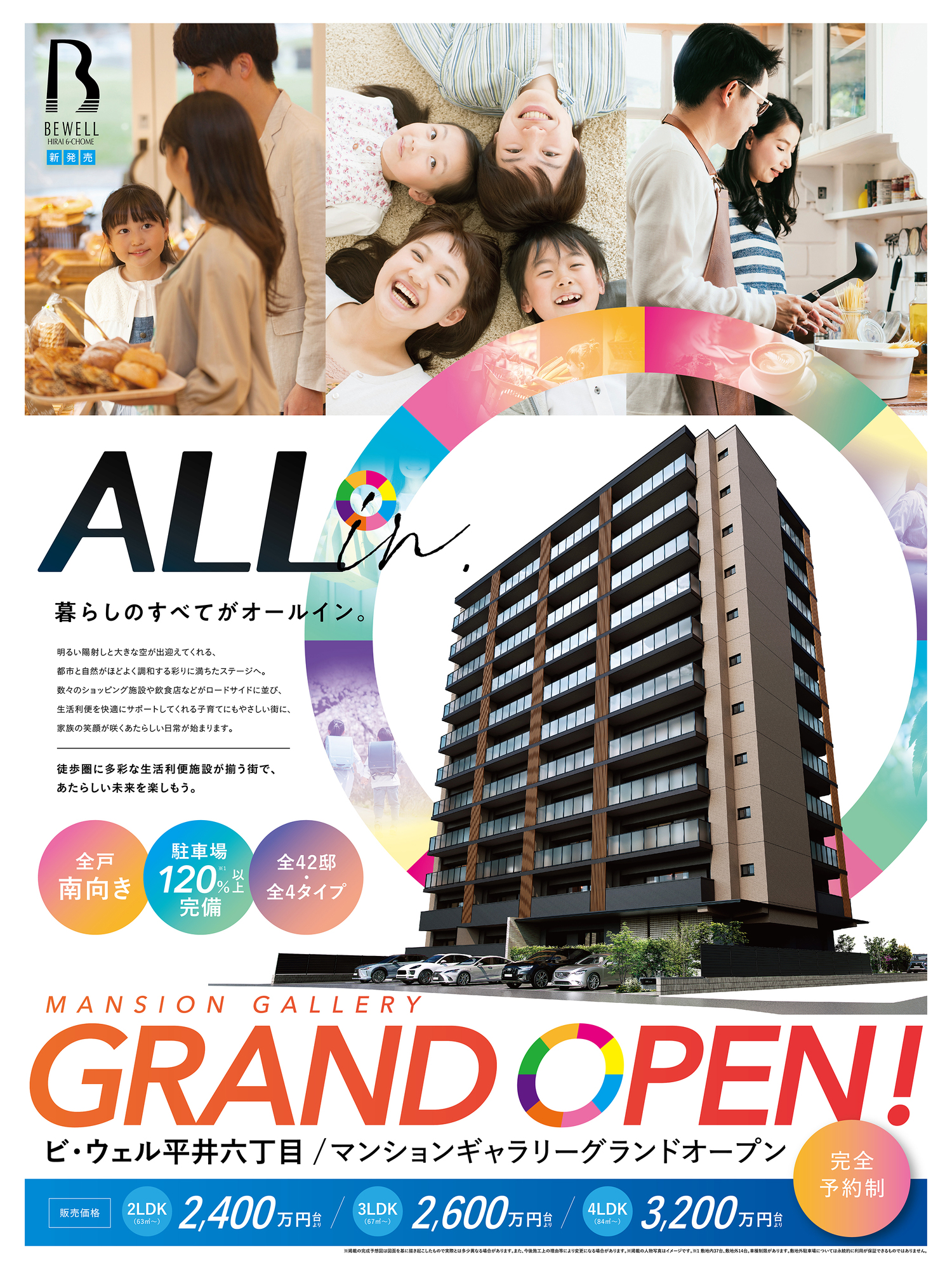 こちらの新物件は全部で42邸の4タイプのお部屋、駐車場は120%完備。