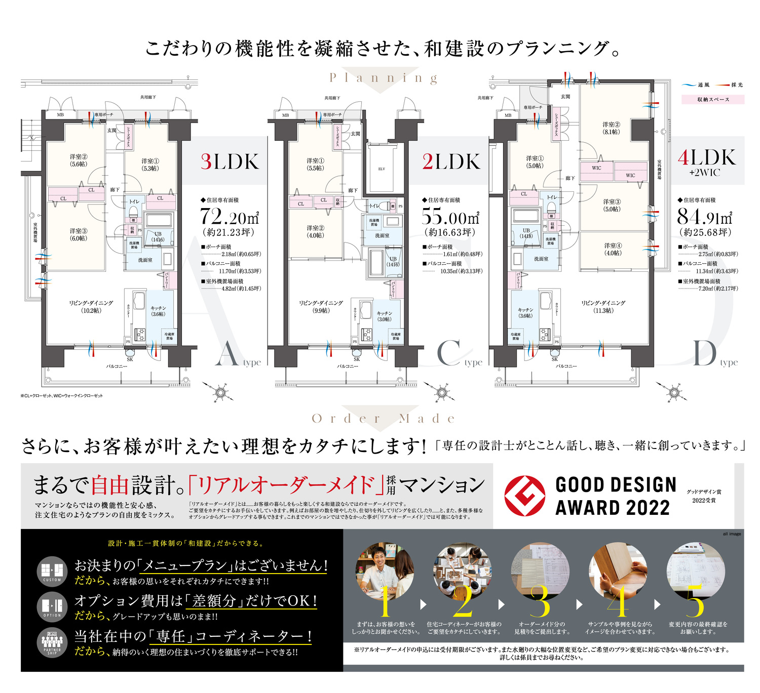 例えばお部屋の数を増やしたり、仕切りを外してリビングを広くしたり・・・設備など多種多様なオプションからセレクトし、グレードアップすることも出来ます。