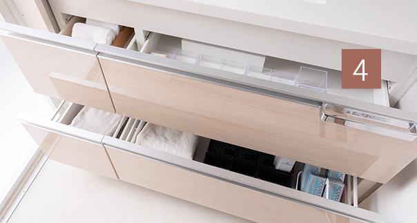 キャビネットは開き扉と2段引き出しを組み合わせ、大きさや形状の異なる洗面まわりのあれこれをすっきりと効率よくしまえます。