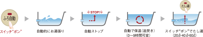 オートタイプスイッチ一つで自動湯張りと自動保温(追焚き)するので、入れすぎ・ぬるすぎの心配を解消。もちろん、お湯が少なくなった際のたし湯も可能です。また、1台の給湯器で浴室・キッチン・洗面室の3カ所の給湯ができますが、低温出湯対応(32℃・35℃)なので、それぞれの場所で快適にお湯が使えます。 |