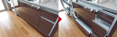 スライド式のキャビネットは、奥にしまった調理器具なども楽な姿勢で取り出せます。大きな鍋から包丁まですっきりと収納でき、キッチンまわりがキレイに片付きます。