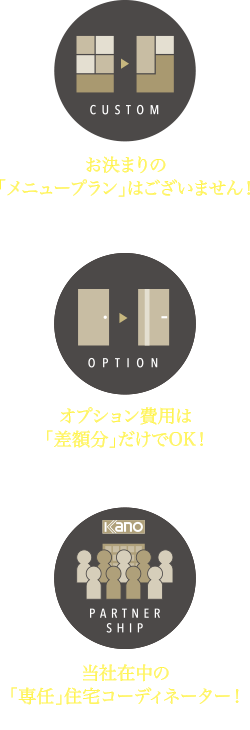 まずは住まいに関する事を何でもお話しください。ご要望をカタチにするお手伝いをしていきます。例えばお部屋の数を増やしたり、仕切りを外してリビングを広くしたり......と、また、多種多様なオプションからグレードアップする事もできます。これまでのマンションではできなかった事が「リアルオーダーメイド」では可能になります。