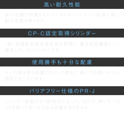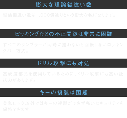 マンションを住まいとして選ぶ理由のひとつにあげられる、高度なセキュリティ性能。その期待にお応えするために、新たに開発した、精密・複雑な2WAYロータリータンブラー方式とロッキングバー方式を組み合わせたハイセキュリティシリンダー「プログレッシブシリンダー」を採用。