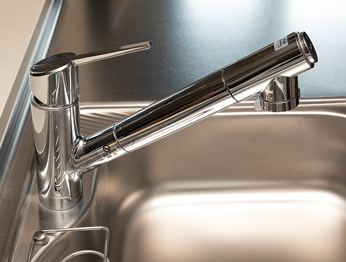 ハンドシャワーに浄水カートリッジを内蔵。いつでも安心な水を利用できます。シャワーホースは引き出して使えるので、食材洗いやシンクの掃除に便利です。