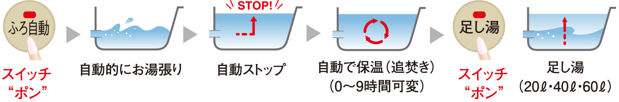 お湯の量や温度を設定して、スイッチを押すだけ。自動的にお湯張りができ、入浴の準備が簡単に整います。自動保温(追焚き)機能が付き、お湯が少なくなった際の足し湯もできます。