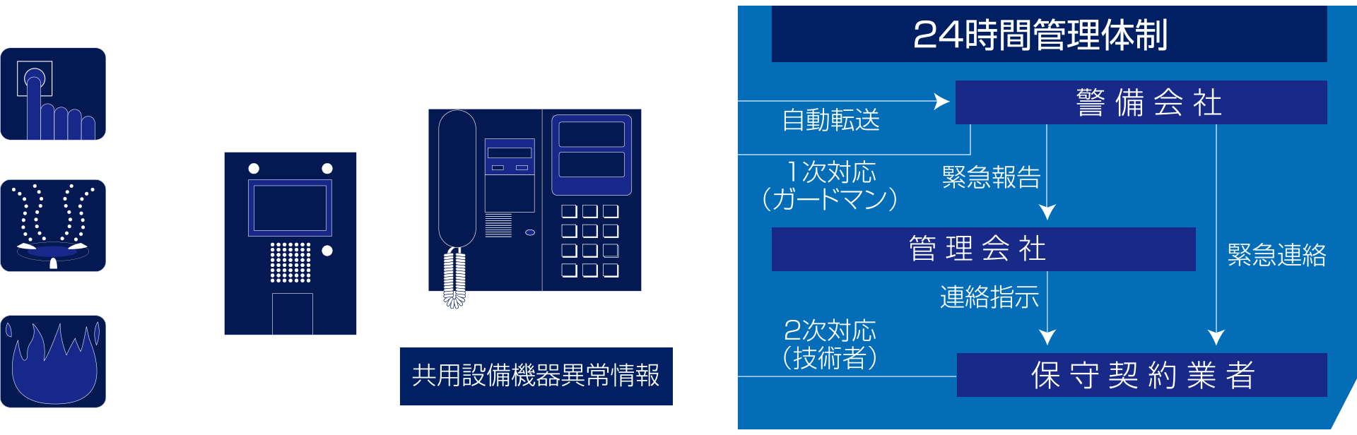 火災やガス漏れをはじめ、万一の事態に瞬時に対応できるよう、警備会社と直結する24時間体制のオンラインセキュリティシステムを導入しました。異常を感知した場合や非常警報は契約警備会社に自動通報され、ガードマンが駆けつけるなど、スピーディーに対処。安心・安全な暮らしをお届けします。