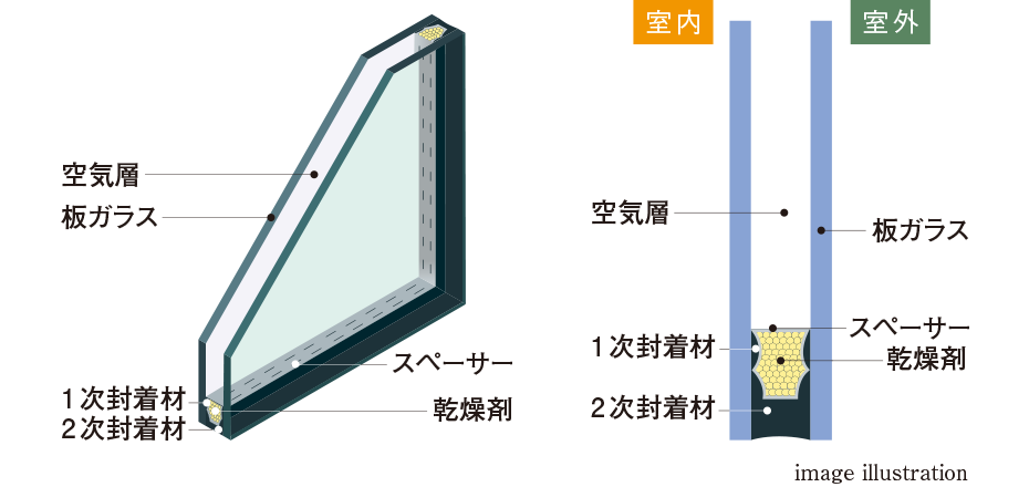 住まいの断熱性能を高め、快適性と省エネ性の向上を図るため、全居室の窓に複層(ペア)ガラスを採用。2枚のガラス間に空気層を設けることで、熱が伝わりにくくなり、大きな断熱効果が得られます。