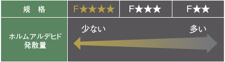 JIS・JASでは、建築材料の中でホルムアルデヒド(シックハウス症候群を起こす主原因となる化学物質)を発散させる恐れがある種類のものを、その発散量によりF★★★★(フォースター)、F★★★(スリースター)、F★★(ツースター)というように分類しています。★の数が多いほどホルムアルデヒドの発散量が少ないことを示します。F★★★とF★★の建材については、法律上、使用する面積が制限されています。(F★★★★の建材は使用制限なし。)