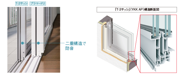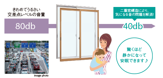 窓から伝わる音の問題を解消するための対策を施しました。優れた遮音性を誇るT-3グレードのサッシを窓に採用するとともに、気密性の高いもう一つの窓を居室側に設ける二重構造を採用。防音効果を一段と向上させました。音環境では最上グレードとなるT-4等級に相当する防音効果が得られます。さらに断熱性や気密性も高まり、優れた省エネ効果を発揮します。