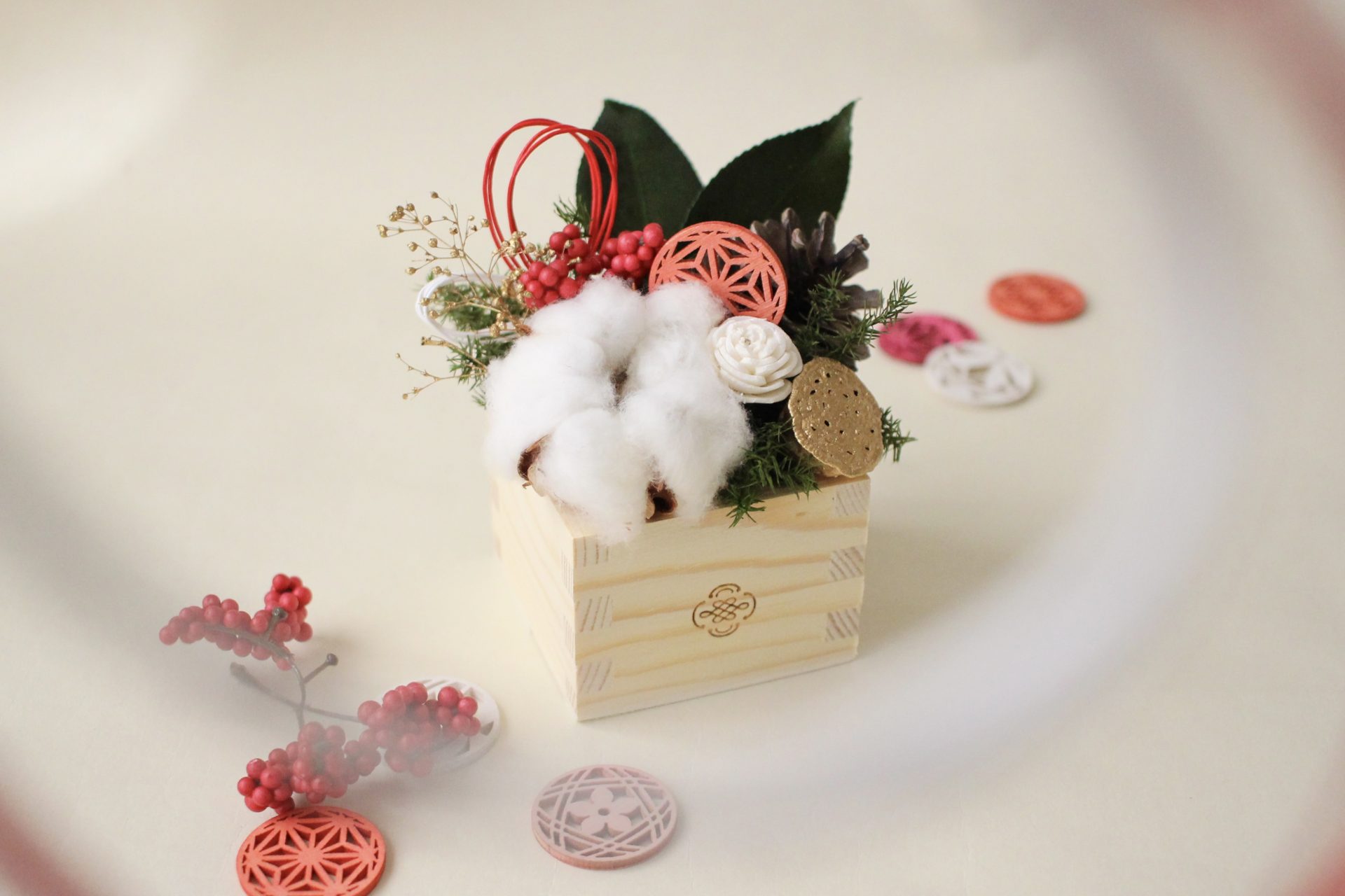 小さな升の中に、自分だけのミニアレンジをつくってみませんか? 水引きやドライフラワー、木の実などのパーツにワイヤーを巻きつけ、バランスを見ながら丁寧にオアシスへ差し込んでいき、じっくりと自分らしいを形にしていく時間です。
