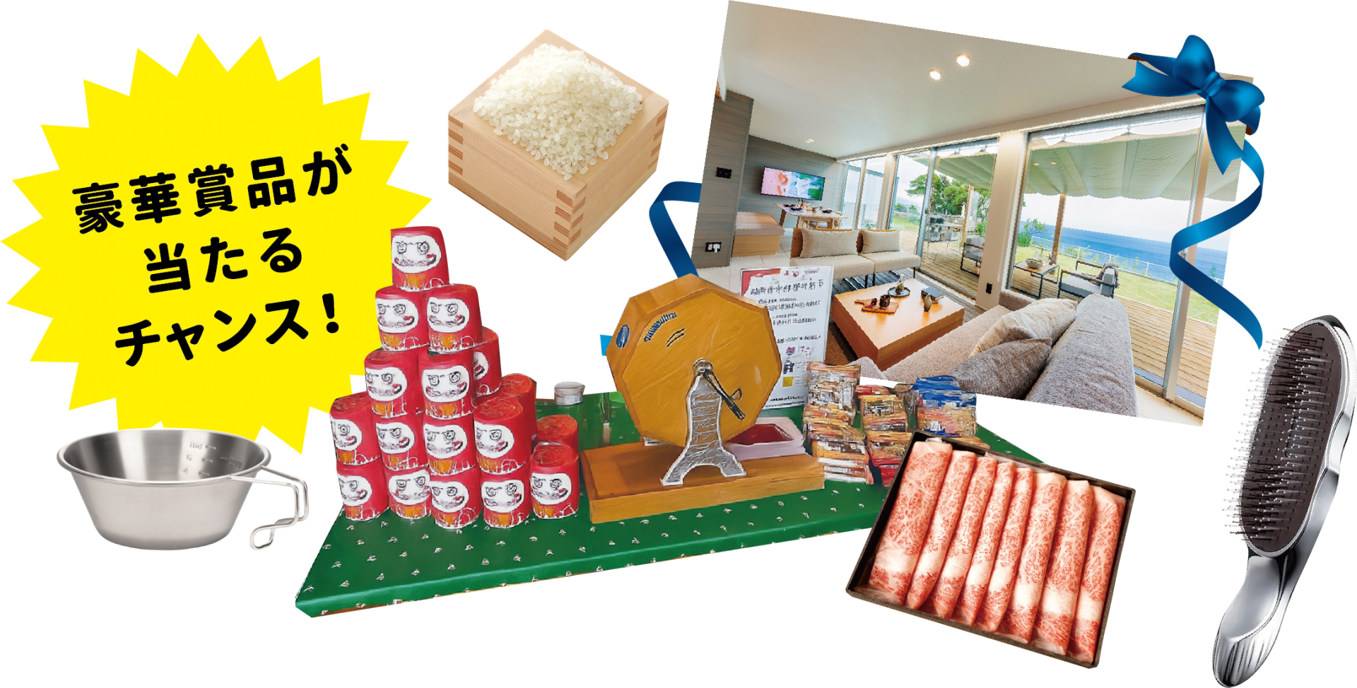 受付にてアンケートにご協力いただいた方には、1棟貸の宿泊施設「ナミテラス芸西」の宿泊券やお食事券、食品ギフト、映画鑑賞券など豪華賞品が当たる空くじなしの抽選会を開催します!