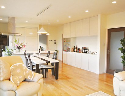 白を基調にしたおしゃれなDKリビング。元は続き和室でした。「お客様が、今どき、こういう大きな空間は珍しいと言ってくれますが、元々の躯体を生かして和建設さんが計画してくれた」。アイランド型キッチンの後ろの食器棚はガラスではなく、透けて見えないように特注。上質で洗練された空間です。